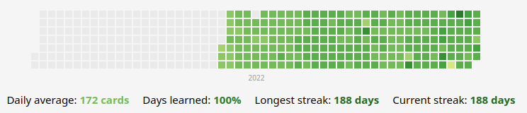 I have the tendency to get very caught up in (unproductive) things and work very intensely on them for days at a time (kind of like I'm doing now with this very essay). The lesson to be learned here is to set things down and pick them up the next day. When it's 10 PM, set down whatever I'm working on, make a cup of tea, watch two episodes of anime, do Anki, and then go to bed. Easy to say, hard to do consistently. That's where the heatmap comes in.