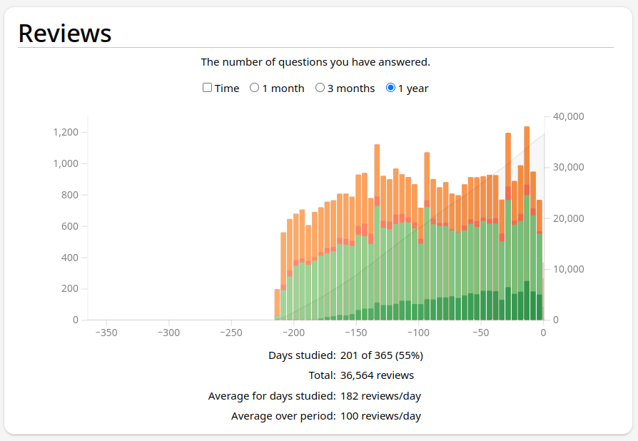 The key to Anki is consistency. Although 200 reviews a day doesn't sound like much, 36,564 reviews certainty does. And although 6,000 words sounds like an overwhelming amount to learn, doing just 20 words a day means you'll finish in 300 days, or just under a year. The key is to actually do 20 words a day, every day, no matter what. Forgetting that you still have 1,760 more words just in this deck to learn, and much more after that...