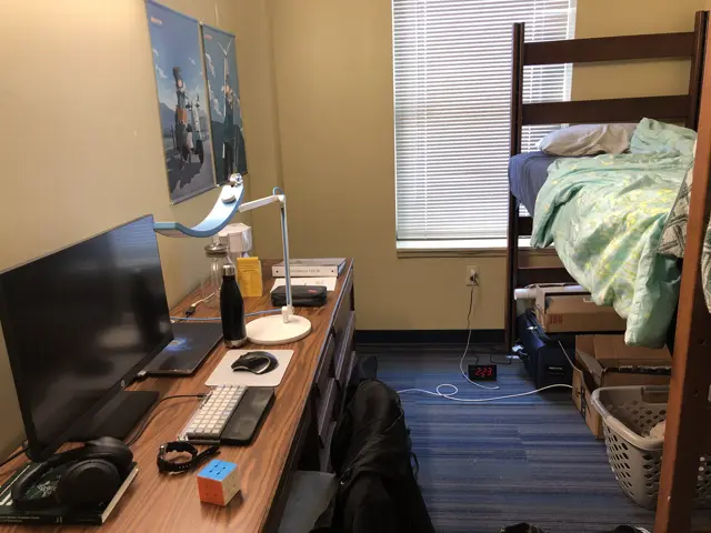 At this time I was still living on campus, in a so-called "traditional" dorm room. I shared this room with a roommate and shared the bathroom on the floor along with common areas like the lounge and kitchen with everyone on the floor. My half of the room looked something like